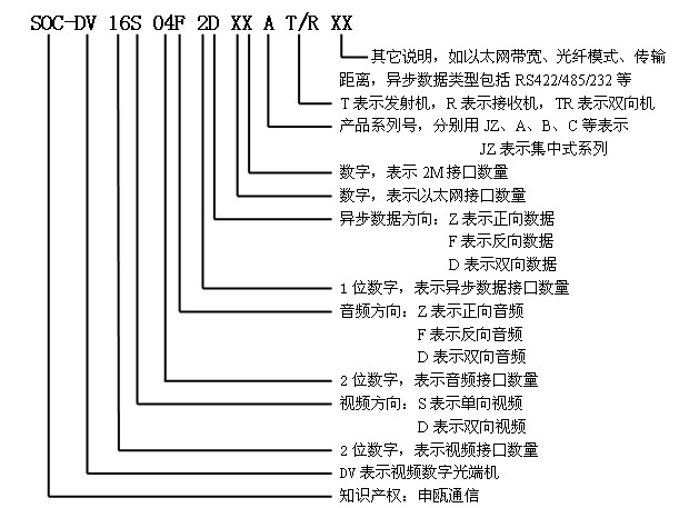 SOC-DV00D04F0D12AT10: 4路反向音频、1个以太网(10M)、2个2M发射A型视频光端机;