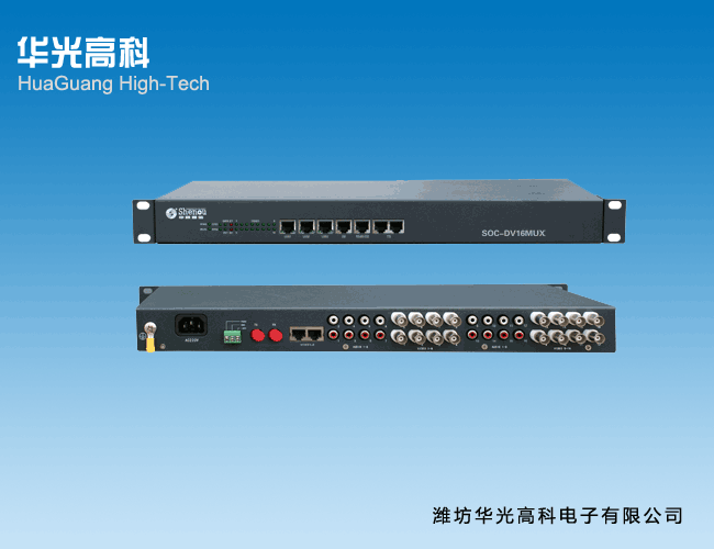 HG-DV16MUX多业务视频光传输平台是华光高科电子有限公司根据市场需求,适时开发出基于视频传输的多业务光传输平台,采用国际最先进的数码视频高速传输技术,将同时把16路视频,16路音频,2路E1接口,4路数据(RS485/RS422/RS232/),8路开关量、8路电话(FXS /FSO/EM/载波/磁石,最多克扩60路电话)、多路10M/100M/1000M以太网等等接口在单芯或双芯光纤上无失真、高质量传输。SOC- DV16MUX多业务视频光传输平台采用全数字无压缩技术,因此能支持任何高分辨率运动、静止图像无失真传输;克服了常规的模拟调频、调相、调幅光端机多路信号同传时交调干扰严重、容易受环境干扰影响、传输质量低劣、长期工作稳定性差等致命缺点。并可同时提供多路视频、音频、数据、电话语音、以太网在光纤上同时传输,大大节省了用户设备投资成本,提高了光缆利用率。系统采用结构化、模块化设计,采用~220V和-48V同时供电,可接蓄电池,保证设备不间断可靠的运行,并可纳入网管系统,具有完善的网管功能。用户可根据现场具体情况灵活选择或定制配置。